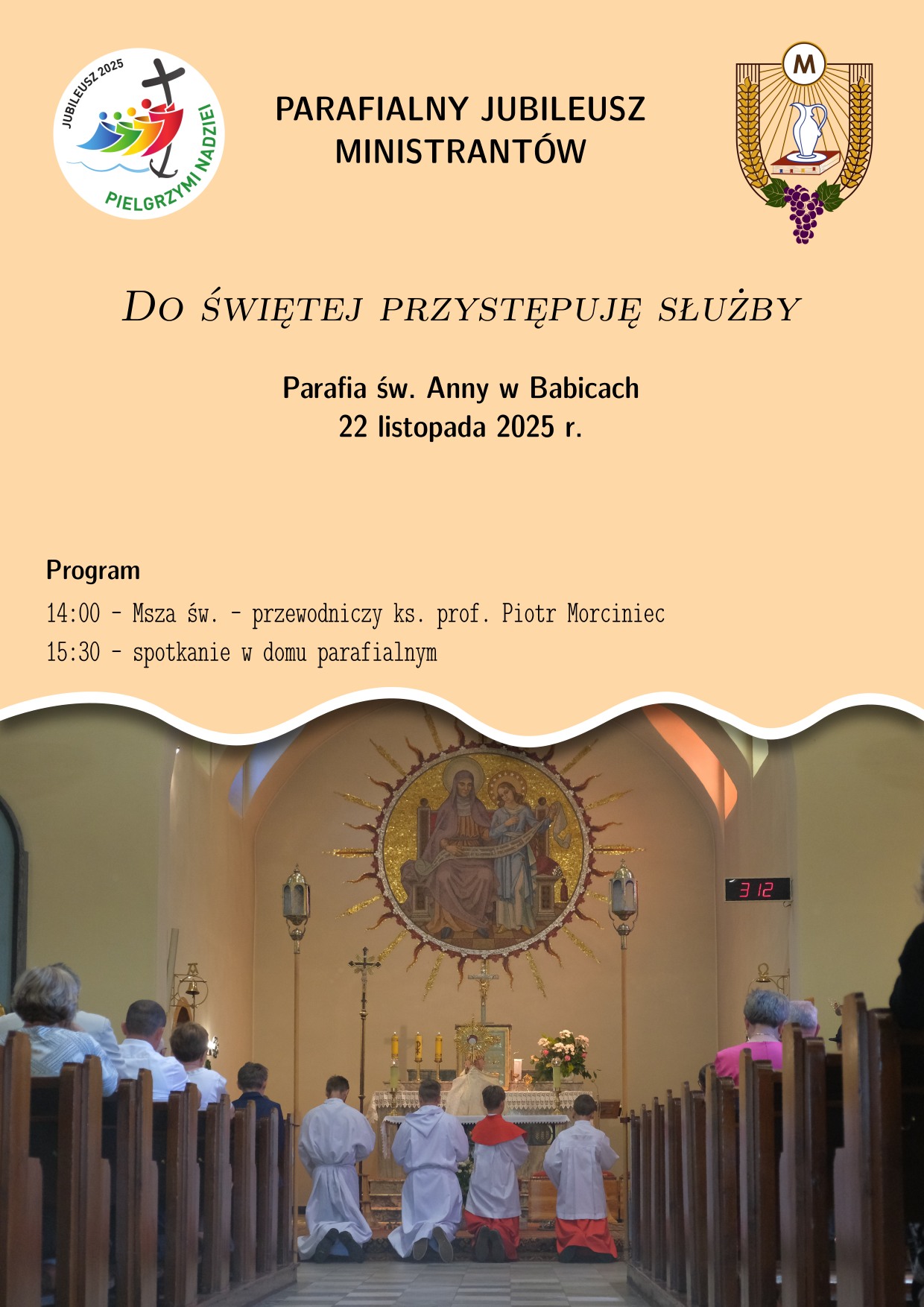 Z okazji roku jubileuszowego chcielibyśmy zaprosić na parafialny Jubileusz Ministrantów - wszystkich, którzy kiedykolwiek pełnili służbę ministrancką przy ołtarzu naszego kościoła. Wydarzenie to odbędzie się w sobotę 22 listopada. Rozpoczniemy je o godzinie 14. mszą św., której przewodniczyć będzie ks. prof. Piotr Morciniec. Następnie w domu parafialnym uczestnicy spotkają się na podwieczorku (kawa i ciasto). Będzie to czas wspomnień oraz odświeżenia i pogłębienia znajomości. Serdecznie zapraszamy na to spotkanie wszystkich byłych i aktualnych ministrantów, zarówno mieszkających w Babicach lub w ich pobliżu, jak i tych, których koleje życiowe zawiodły w dalszy świat. Proszę o przekazanie tej informacji dalej, tak by dotarła do jak największej liczby zainteresowanych.